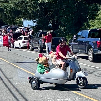 The weather was perfect if not a bit too hot! Our primary BBQ master actually passed out from the heat which caused a bit of alarm. He is OK but a bit shaken. The parade was a little bigger than previous ones and the helicopter fly past by one of Maple Bay's generous neighbors is always a star feature of the event. A 40 piece adult band provided background music and performed the national anthem after the boring speaches by local government types were over. We were very fortunate to have an RCMP officer in full serge lead the parade.